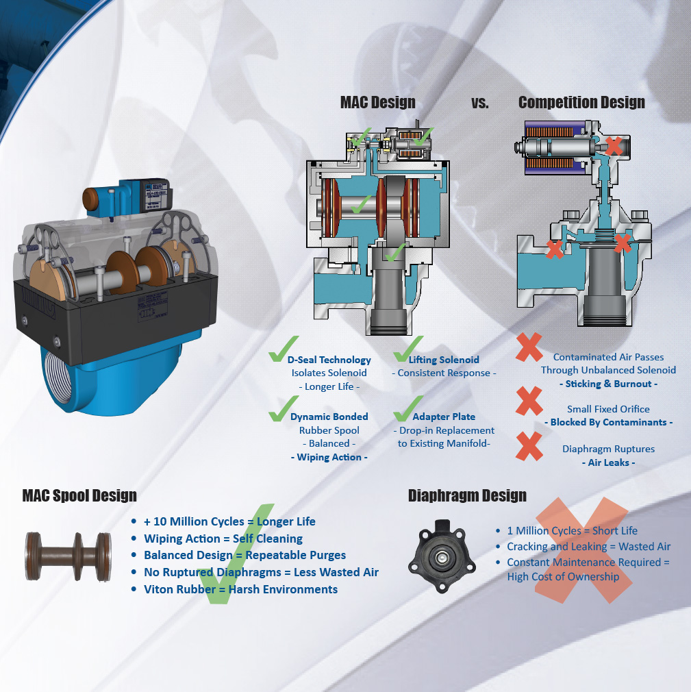 ด้วยเอกลักษณ์ของ MAC Spool Technology ทำให้เกิดนวัตกรรม MAC Spool Pulse Valve ล่าสุด ซึ่งออกมาแก้ปัญหาอาการรั่ว แตก ซึม ของ diaphragm pulse valve ดั้งเดิม ในเครื่อง Dust Collector ทั้งหมด ส่งผลให้ลดค่าใช้จ่ายด้านพลังงานทั้งไฟฟ้า และปริมาณลมอัด ตลอดจน sparepart ได้อย่างมหาศาลต่อปี